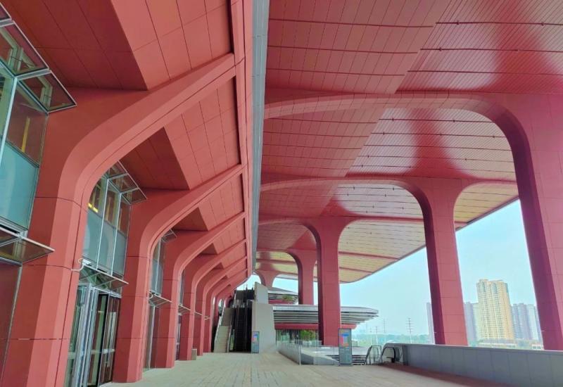 南立面主导墙面采用西安特有赤陶板,每块经1280℃高温淬炼出秦俑般的古朴质感,方正轮廓与拱形结构暗合“天圆地方”哲学,既延续周秦高台建筑的雄浑气韵,又以现代力学实现结构稳固。