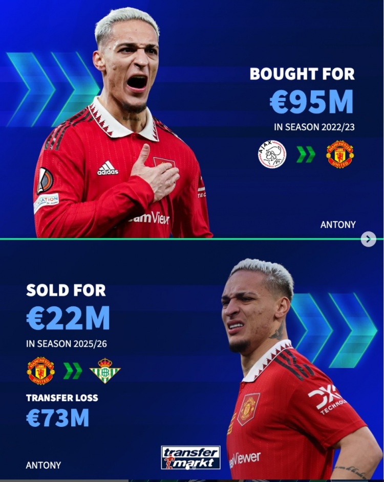 2022年夏窗,曼联以9500万欧元从阿贾克斯引进安东尼,今夏以2200万欧将其卖给贝蒂斯。净亏7300万欧。
